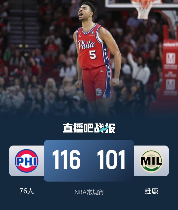 比赛开始,双方上来就对攻,连续外线对飙,76人7-0建立领先后外线连中3记三分,首节76人领先13分,次节贾巴里·沃克外线连中3记三分扩大领先,波蒂斯也能回应,但76人外线多点开花还是领先到20分以上。下半场,双方围绕着20分左右分差展开拉锯战,76人外线保持手感,小凯文·波特连续突破杀伤单节砍下13分,雄鹿三节追到差16分,末节76人进攻端受阻,雄鹿一度追到10分,但乔治连续进攻稳住局势,76人保持住两球以上领先,最终76人116-101战胜雄鹿,拿到3连胜。
